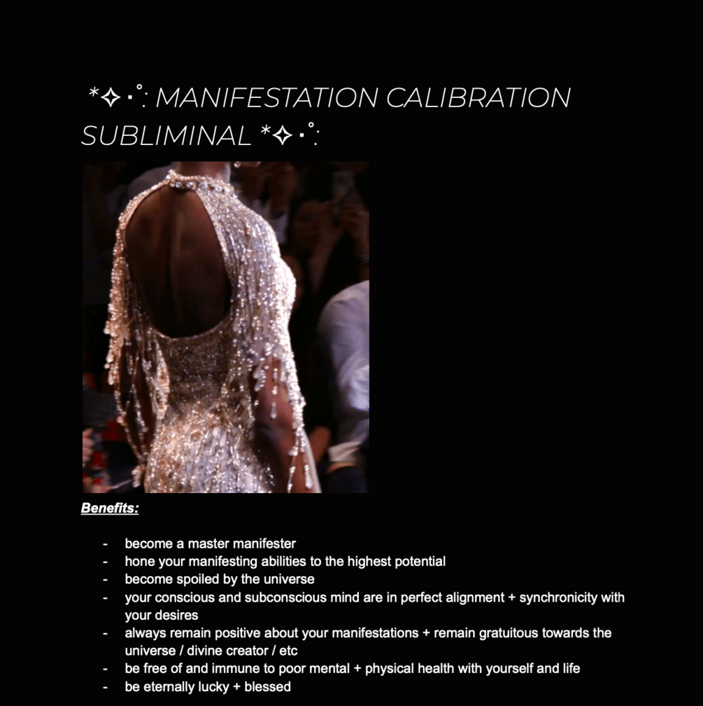 Customized subliminals created by me. These subliminals feature dual technologies that reach deep into your subconscious, bypass the conscious mind and gets directly to the database, where the positive reinforcement of new data can be installed.